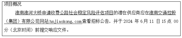2、項(xiàng)目名稱:淮南淮河大橋申請(qǐng)收費(fèi)公路社會(huì)穩(wěn)定風(fēng)險(xiǎn)評(píng)估項(xiàng)目